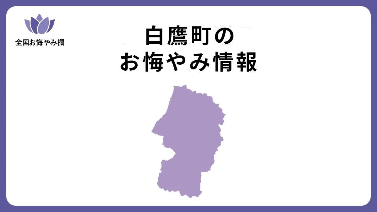 🕯️山形県 西置賜郡 白鷹町(しらたかまち)の斎場・葬儀場一覧 西置賜郡白鷹町の斎場・葬儀場一覧「3か所」掲載中です。名称、住所、電話番号を掲載しております。葬儀場名を押せば、詳細情報を確認することができます。 名称 住所 電話番号 セイノヤホール 西置賜郡白鷹町荒砥乙548-1 ナウエルホール白鷹 西置賜郡白鷹町大字荒砥甲629-1 0120-38-9494 正念寺 西置賜郡白鷹町荒砥乙885 0238-85-2757 山形県全体の葬儀場を見る 白鷹町のお悔やみ情報を見る 📍山形県の市区町村で探す あ 朝日町 飯豊町 大石田町 大江町 小国町 尾花沢市 か 金山町 河北町 上山市 川西町 さ 寒河江市 酒田市 鮭川村 庄内町 白鷹町 新庄市 た 高畠町 鶴岡市 天童市 戸沢村 な 長井市 中山町 南陽市 は 東根市 ま 真室川町 村山市 最上町 や 山形市 山辺町 遊佐町 米沢市 大切な想いを、適切な言葉に。「お悔やみの言葉」を簡単作成。 作成する 訃報を受けた際の適切な対応手順 PDFダウンロード 🏠ホーム > 全国の葬儀場情報 > 山形県の葬儀場情報 > 白鷹町の葬儀場情報